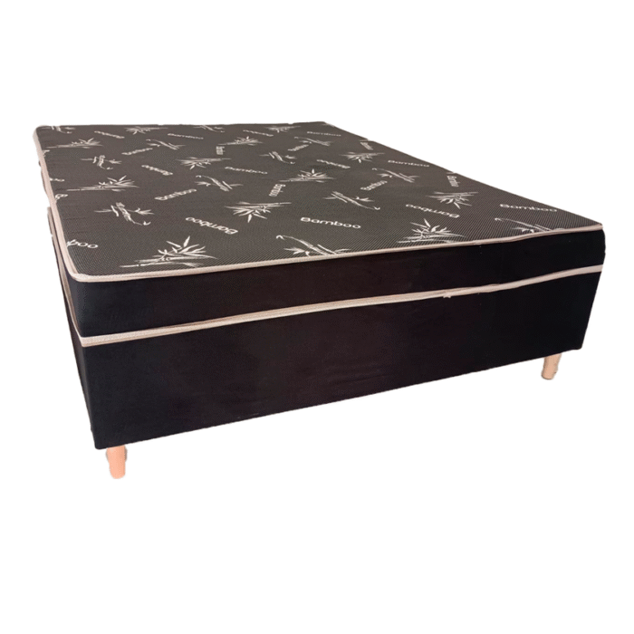 Conjunto box com colchão de espuma D28 com 30cm de altura (suporta 200kg cada lado do colchão), com pezinhos em madeira.